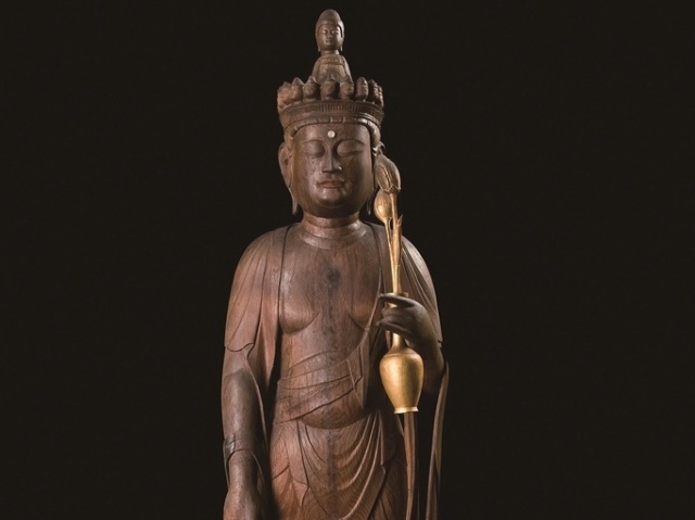 像高182.4cm・台座の高さ9.0cmの桧材一木造彫眼で衣文の彫り、裳の折り返し、裾など穏やかで丸みをおび、 温和で均整のとれた像です。