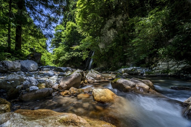 透き通る水と岩に張り付く苔のきれいな川は「ぎぶ水と緑の環境百選」にも選ばれており、水のきれいさのヒミツは、円原川が「伏流水」であること。伏流水とは流れる水が一旦地中に潜りこみ、ふたたび岩間から湧き出る現象のことをいいます。円原川は付近が石灰岩質の岩場であり、約2キロほど地中に潜る間に浄化されていることがきれいさの要因と考えられます。