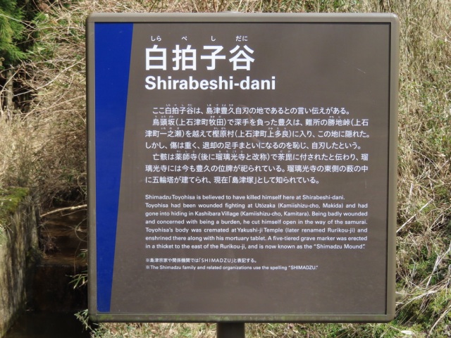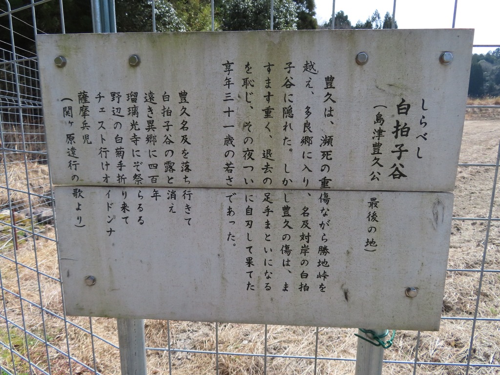 白拍子谷 <島津の退き口ゆかりの地>(しらべしだに <しまづののきぐちゆかりのち>) 島津豊久公自刃の地 烏頭坂で重傷を負った島津豊久公を、家臣・川口運右衛門の意を受けた三輪内助入道一斉がこの地に案内したが、豊久公は自刃して果てた。白拍子谷は、伊勢街道(伊勢西街道)を入った名及集落の南を流れる堂木川の対岸にあり、小さな標柱が立つのみで、辺り一帯はひっそりと静まり返っています。 エリア 西濃 大垣市 カテゴリー 歴史を知る 戦国・城郭 Loading... フォトツアーを見る 基本情報 住所 岐阜県大垣市上石津町上多良2045-1