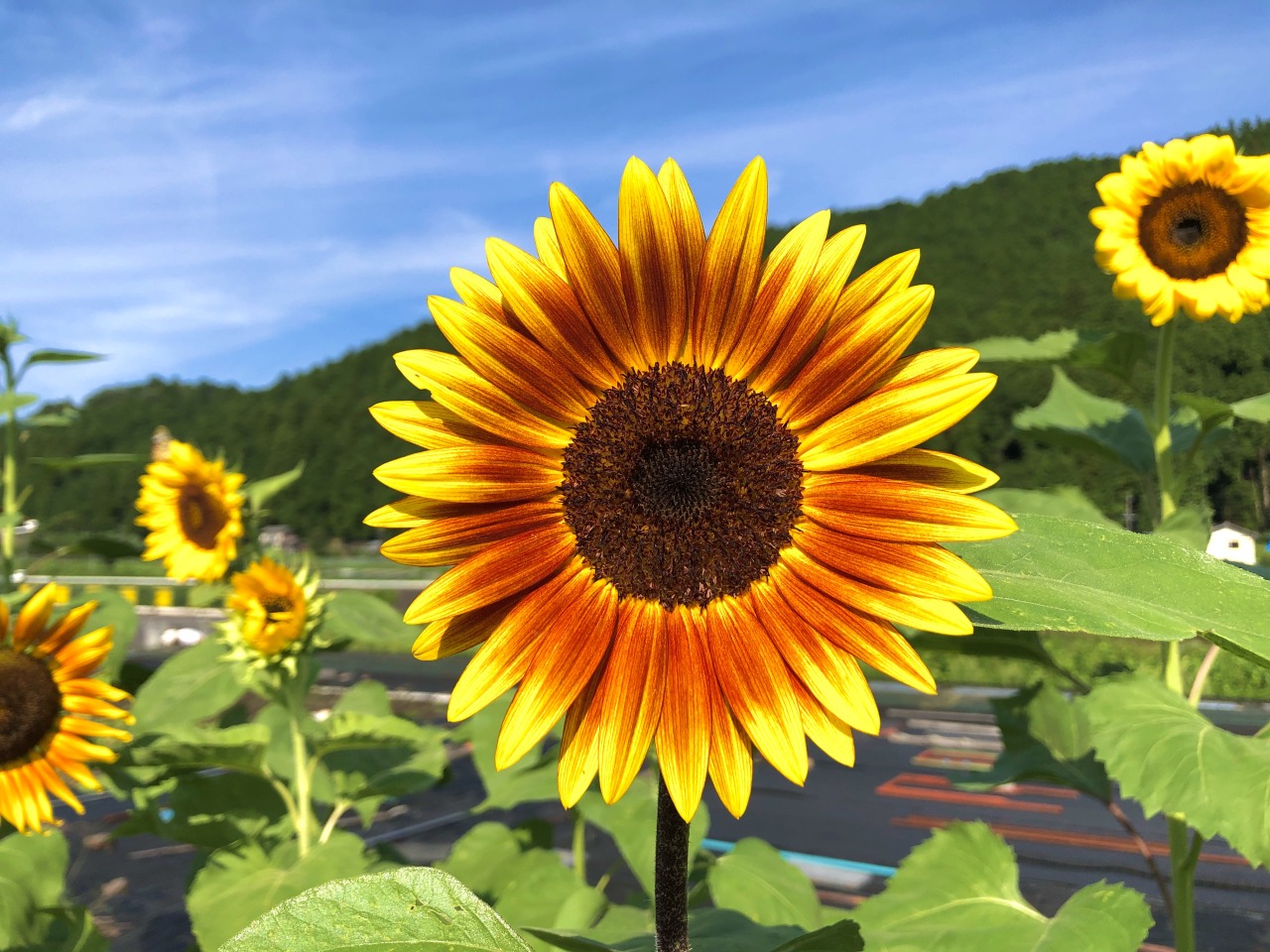 いろいろな品種のひまわりが栽培されており、赤やオレンジや白のカラフルなひまわりや、それらの品種の交雑による突然変異で他では見られない花も咲きます。