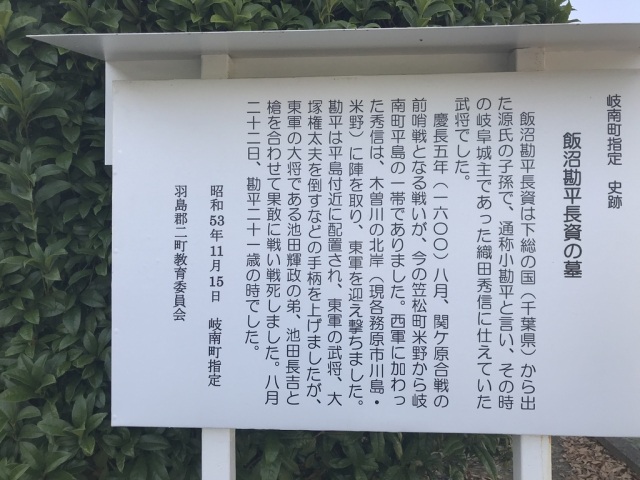 飯沼勘平長資の墓(いいぬまかんべえながすけのはか) 「岐阜四天王」の一人と伝わる猛者。 飯沼勘平長資は、岐阜城主・織田秀信(三法師)の家来で「岐阜四天王」の一人。関ケ原の合戦の前哨戦、「米野の戦い」で多くの手柄を立てた当時21歳の武将(大垣 池尻城主の子)。東軍大将池田輝政の弟、池田長能と一騎打ちをして戦死しました。尚、南西約500mの場所には、米野の戦い跡の碑(岐阜県羽島郡笠松町)が建てられています。 エリア 岐阜・中濃 岐南町 カテゴリー 歴史を知る 戦国・城郭 Loading... フォトツアーを見る 基本情報 住所 岐阜県羽島郡岐南町平島1丁目 ウェブサイト https://www.town.ginan.lg.jp/1293.htm