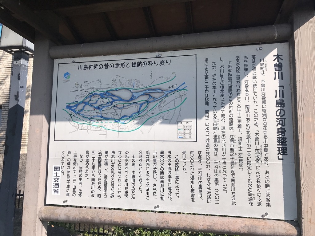 - 川島会館4階に木曽川文化資料館があります。案内板は、正面玄関前に設置されています。