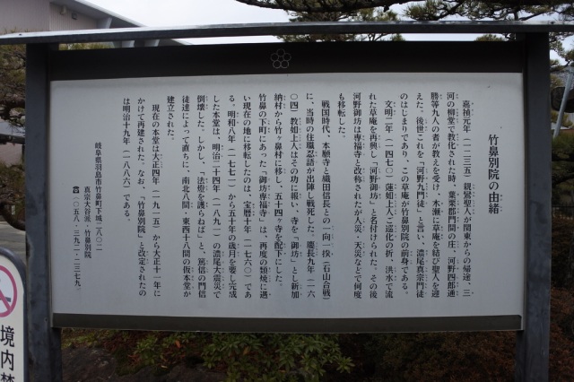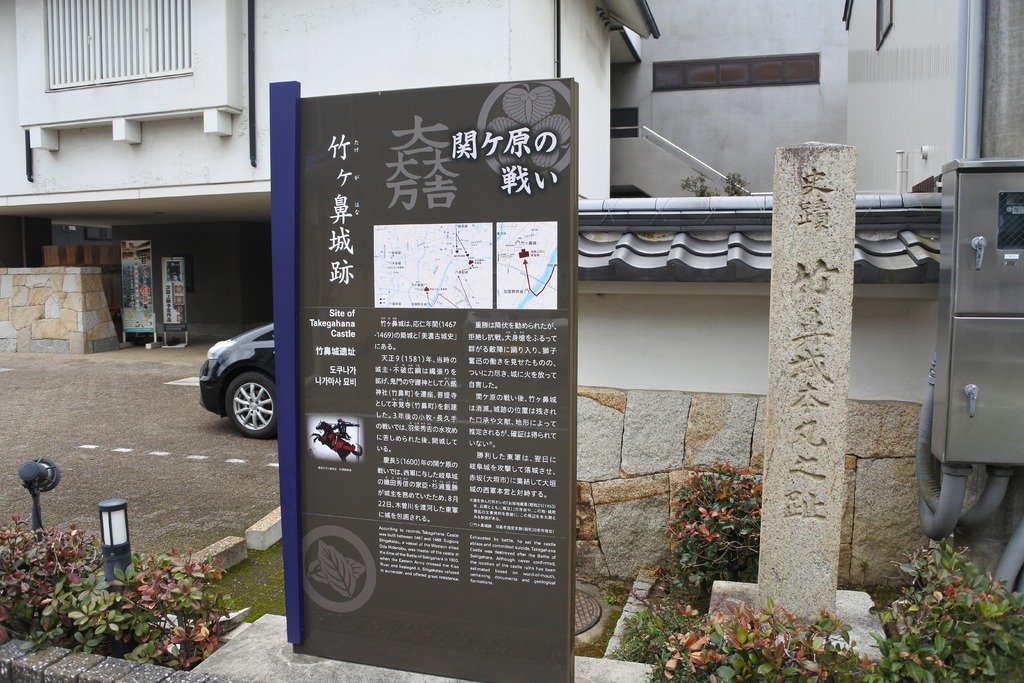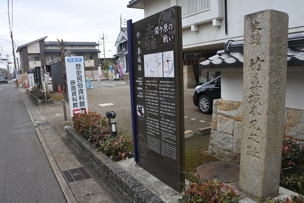 羽島市歴史民俗資料館(竹鼻別院前)の敷地内に竹ヶ鼻城跡の石標は立っています。