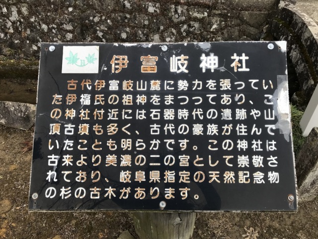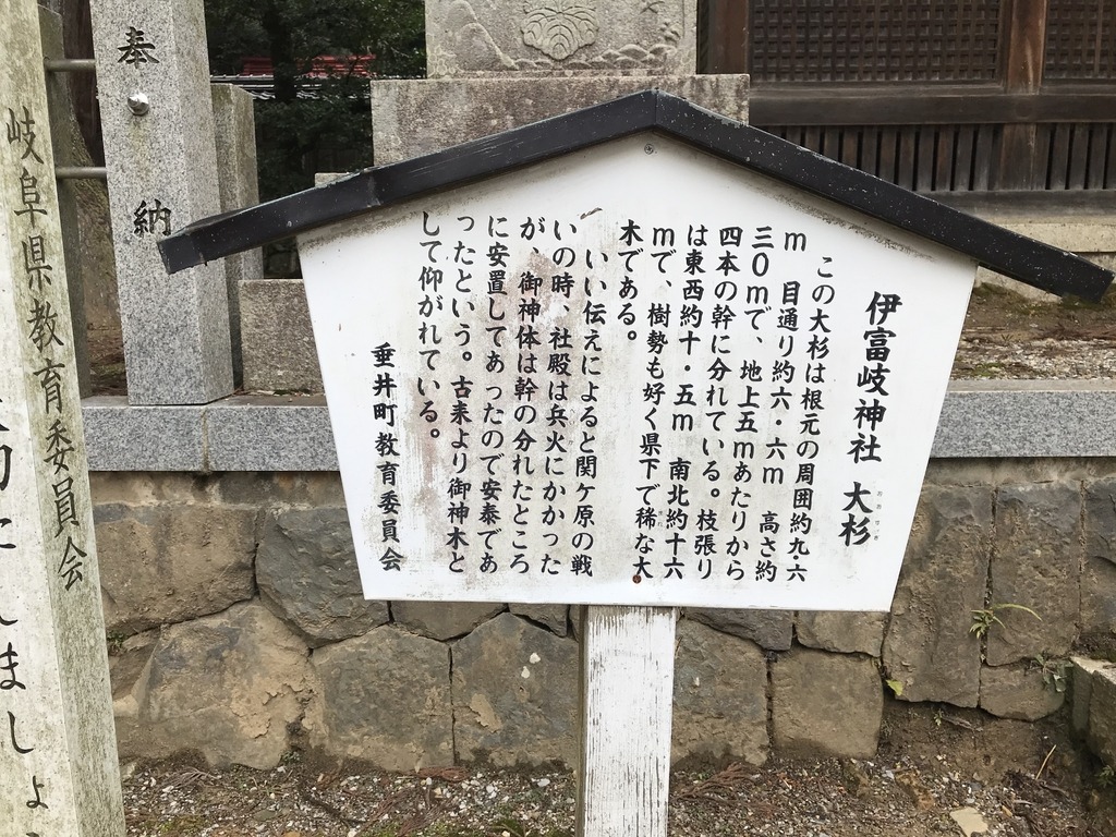 拝殿脇の御神木「伊富岐神社の大杉」は、岐阜県の天然記念物に指定されており、根元の周囲約9.6m、目通り約6.6m、高さ約30mで、地上5mあたりから4本の幹に分かれ、枝張り東西約10.5m、南北約16mで樹勢も好く県下でも稀な大木です。