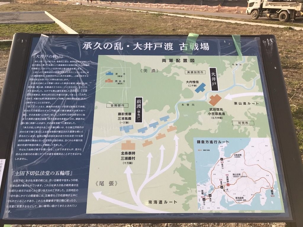 この地では、朝廷側(大内惟信)2000騎と幕府側(武田信光・笠原長清ら)東山道軍50,000余軍に東海道軍100,000余軍が合流し、大井戸を渡って戦い圧倒的な差で幕府側が勝利しました。