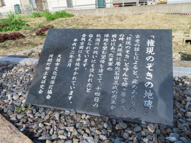 権現のぞき(ごんげんのぞき) 西軍の望楼のあった河間故郷桜堤 この辺り(大垣市河間)を「権現のぞき」と呼んでいたと伝えられています。関ケ原の合戦の時、大垣城に居た西軍 石田三成が、東軍の陣地「岡山(勝山)」を望む望楼を立てました。慶長5年(1600年)9月14日、関ケ原の合戦の前哨戦 杭瀬川の戦いにも使われました。関ケ原の合戦図にも井楼が書かれています。 エリア 西濃 大垣市 カテゴリー 歴史を知る 戦国・城郭 Loading... フォトツアーを見る 基本情報 住所 岐阜県大垣市河間4-45 河間故郷桜堤(東側下) アクセス 【公共交通機関】・JR大垣駅前(南口)から名阪近鉄バス・赤坂線利用約18分河間バス停下車、徒歩5分(約0.4km)【車】・東海環状道 大垣西ICから約4分(約2.3km) 備考 ・駐車場はありません。・河間故郷桜堤は、車1台が通行できる程度の道路ですのでご注意下さい。