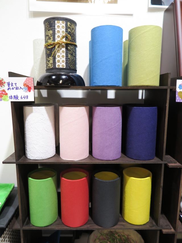 和紙を貼った筆⽴てを常時10⾊準備。その筆⽴てに準備してある、美濃和紙の抜き紙パーツや切り紙を切ったり貼ったりして、オリジナルの和紙筆⽴てを⼿作りする体験。できた作品はすぐお持ち帰りでき、筆⽴てやめがね入れなどに使っていただけます。1300年の歴史ある美濃和紙に触れ、オリジナルに制作ができる楽しい体験です。