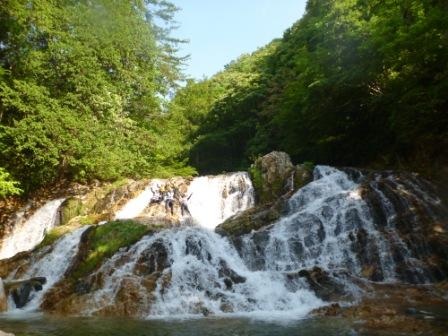 連続する滝と美しい滑床を歩く変化に富んだコースは、⽔遊びの魅 ⼒がいっぱいです。 緑深く大きな滝つぼのある「的⽮滝」、滝裏くぐりと滝つぼジャンプのできる「銚子滝」、