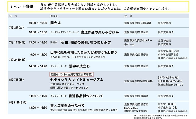 茂住菁邨(本名:茂住修身)氏は飛騨市古川町出身の書家です。大東文化大学在学中より青山杉雨に指示し、現在まで日展の公募展に出品するなど「書道」を追求し続けています。書家として活躍する一方、大学卒業後はその能力を活かして内閣府の辞令専門職の任に就き、総理大臣や国務大臣の認証官等の辞令書揮毫に携わりました。新元号「令和」発表の記者会見では、官房長官の掲げた墨書を茂住氏が揮毫したことは記憶に新しく、氏の書がより一層全国に知れ渡る転換点となりました。本展覧会では、41年に渡る辞令専門職としての任務を紹介するとともに、茂住氏の書家として足跡を振り返ります。