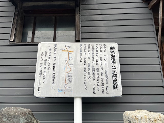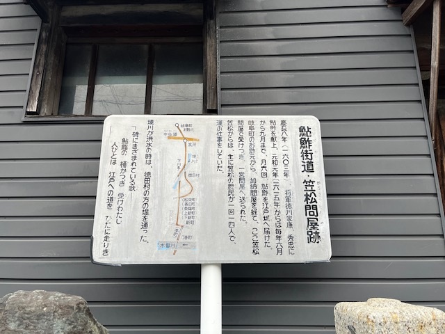 鮎鮨街道・笠松問屋跡(あゆずしかいどう・かさまつとんやあと) 鮎鮨を徳川家康に献上する為に通った道 長良川の鵜飼でとった鮎を使用した鮎鮨(あゆずし)を将軍徳川家康に献上する為に通った道。岐阜城の麓にある御鮨所を出発し、加納宿を経た荷物は、笠松の問屋「高嶋家」で引き継がれ、一宮問屋へ送られた。 エリア 岐阜・中濃 笠松町 カテゴリー 歴史を知る Loading... フォトツアーを見る 基本情報 住所 〒5016073 岐阜県羽島郡笠松町下新町