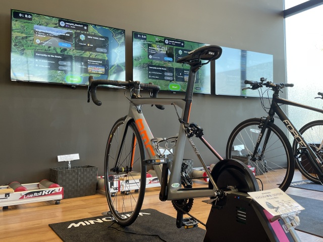 天候に左右されず自転車ツーリングを体験できる、スマートトレーナーやガイド付きのサイクリングツアーも実施。シャワーブースも備えています。