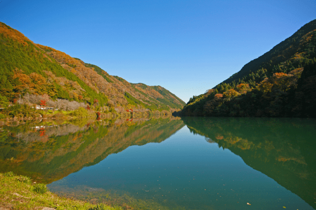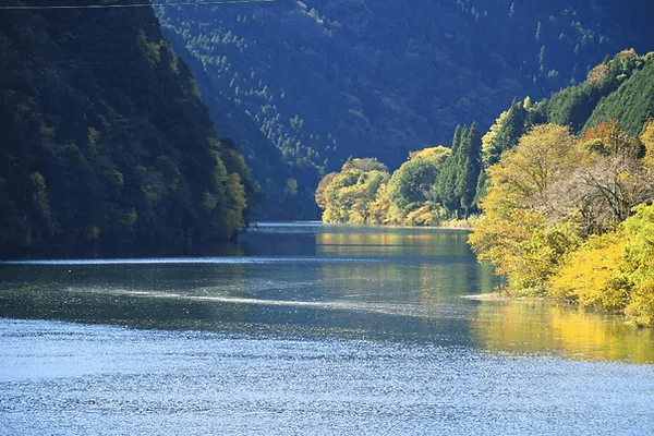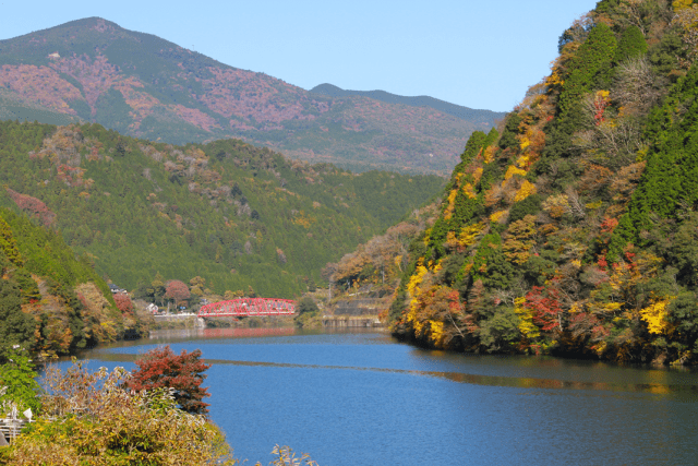 湖畔のサクラも見事ですが、谷あいの湖面に映える秋の紅葉は特に有名です。