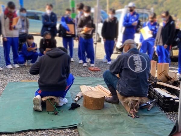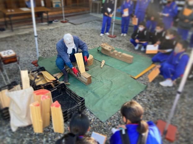 かしも明治座の屋根は伝統構法による改修が行われ、創建当時の姿の榑葺き屋根に復元されました。このプランでは、文化の継承を目的に学生さんを対象に榑葺き屋根の制作体験を行なっています。