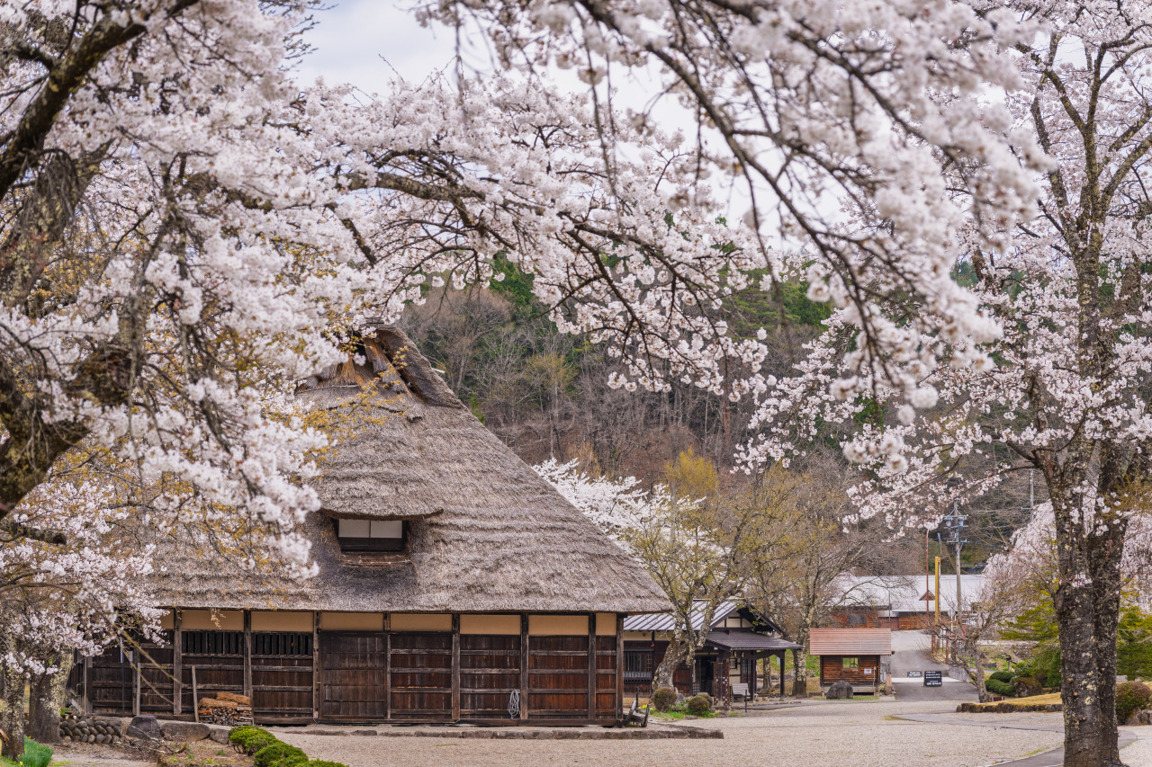 一帯は桜の名所としても知られています。合掌造りを優しく見守るように咲く桜は穏やかな山村風景そのものです。