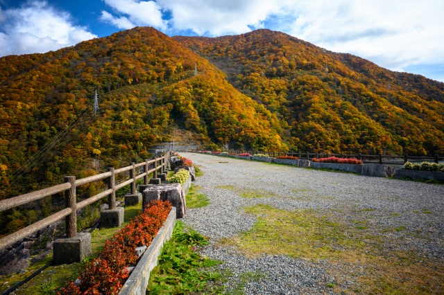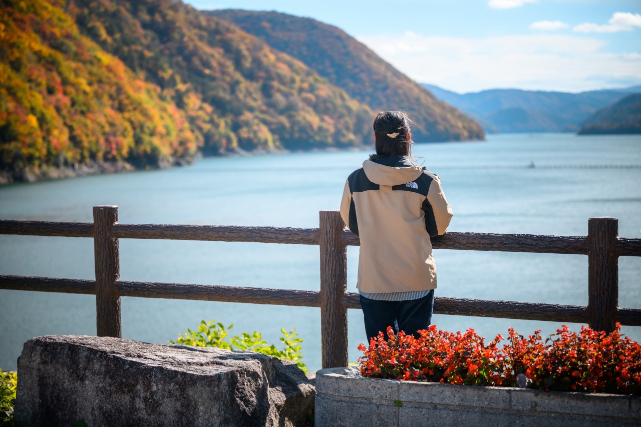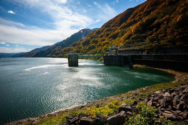 堰堤の一部が展望台になっており、御母衣湖の静かな湖面の眺めが美しい絶景スポットです。特に10月下旬~11月上旬には、神秘的な美しさをたたえた大きな湖に紅葉が豊かな彩りを添えます。エメラルドグリーンの湖面と紅葉のコントラストは、飛騨・美濃紅葉33選にも選ばれた紅葉の名所です。