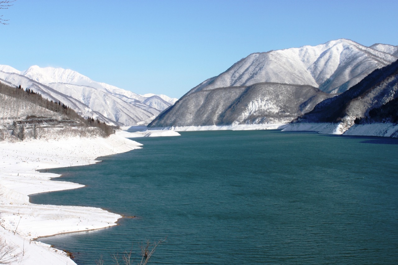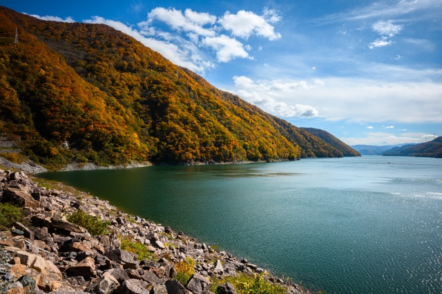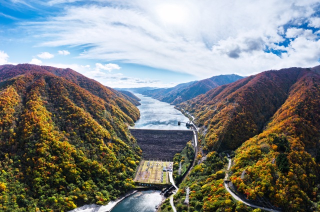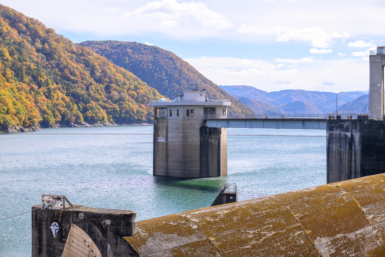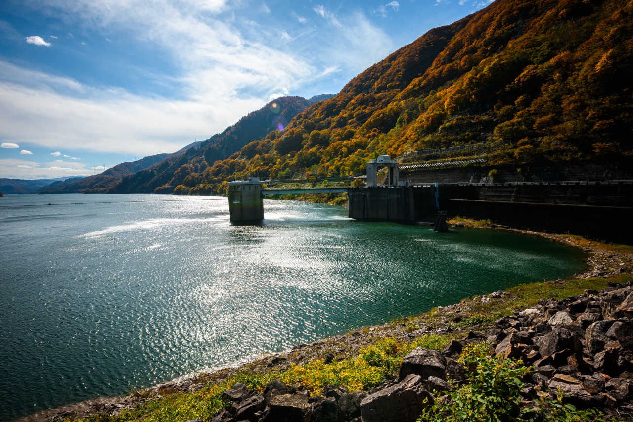 御母衣(みぼろ)ダムは、庄川を堰き止めて造られた高さ131メートル、長さ405メートルの巨大な日本初のロックフィル式ダム。ロックフィルダムは、岩石や土砂を積み上げて構築する形式のダムのことで、完成当時はその巨大さから「20世紀のピラミッド」とも形容されました。湖水面積8.8平方キロメートル、設置の御母衣発電所は最大出力215,000キロワットのダム湖で、現在でもロックフィルダムとしては総貯水容量が徳山ダムに次ぎ、日本第2位です。