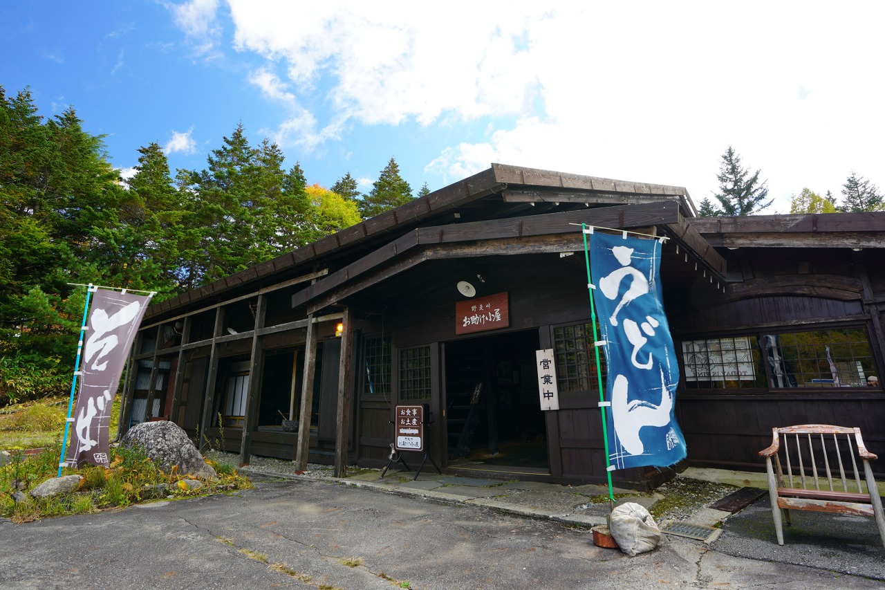 お助け小屋の由来は江戸時代にさかのぼります。「厳しい峠越えにより命を落とす者が多いことから、小屋を建て、番人を置き、峠越えをする者を救いたい」という願いを幕府が聞き入れ、天保12年(1841)に建てられました。雪の峠を越えた工女達が体を休めたのも、このお助け小屋です。現在のお助け小屋は、昭和45年に野麦集落の古い家屋を移築したものです。毎年5月1日山開きが行われ、11月中旬までの通行者の安全が祈願されます。