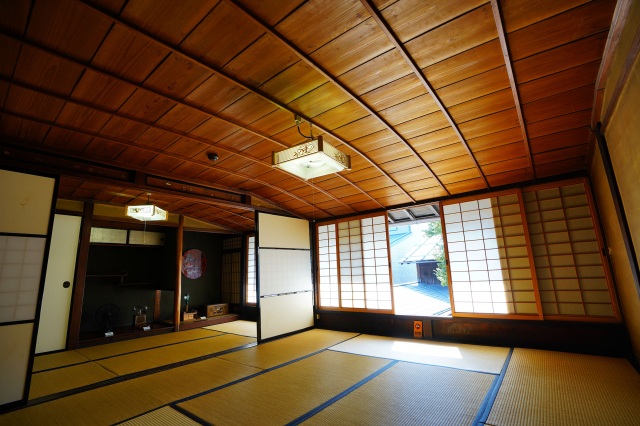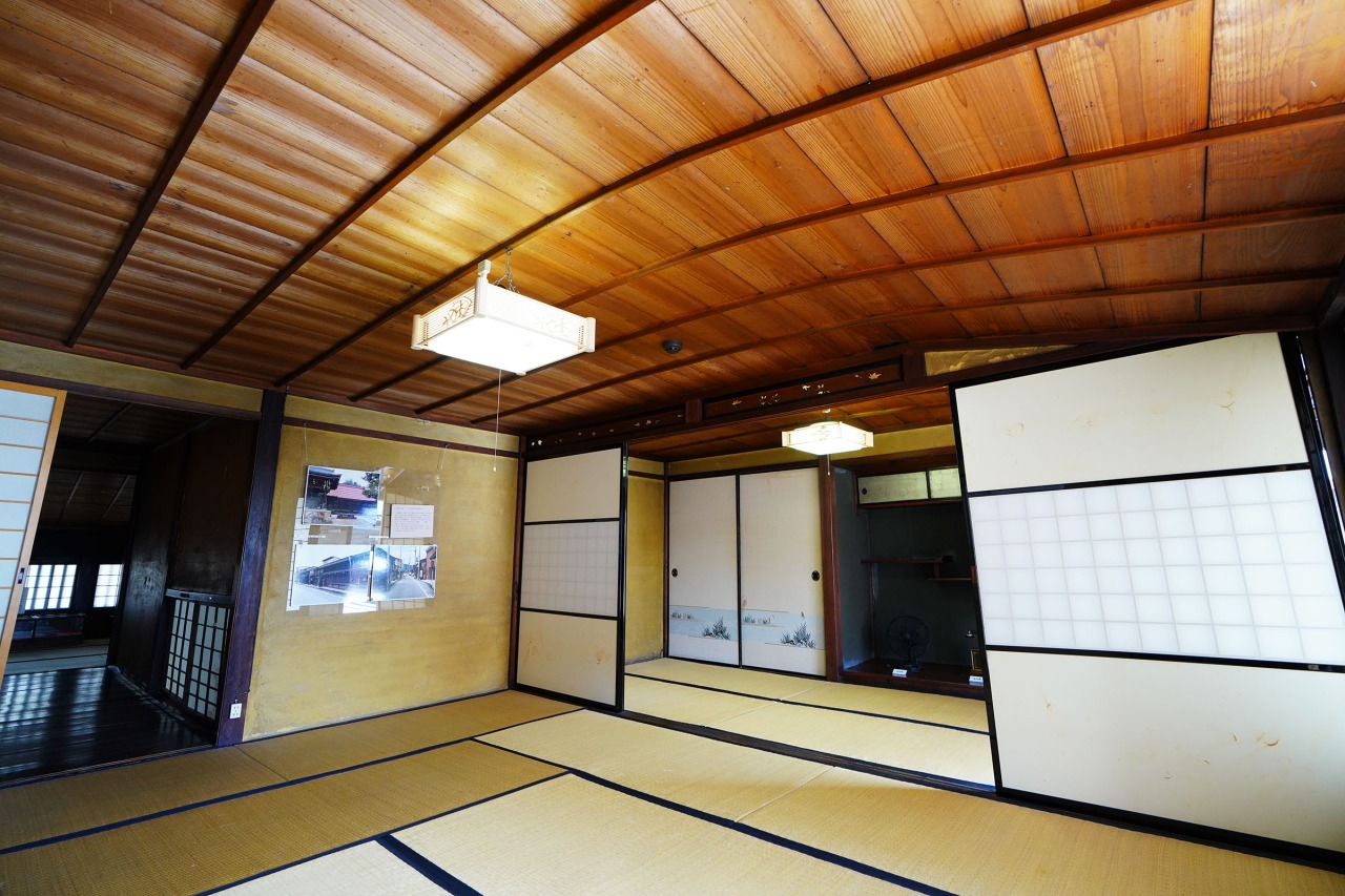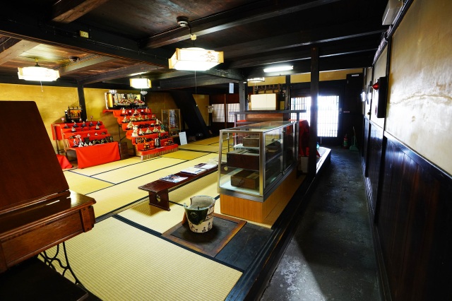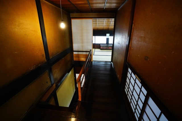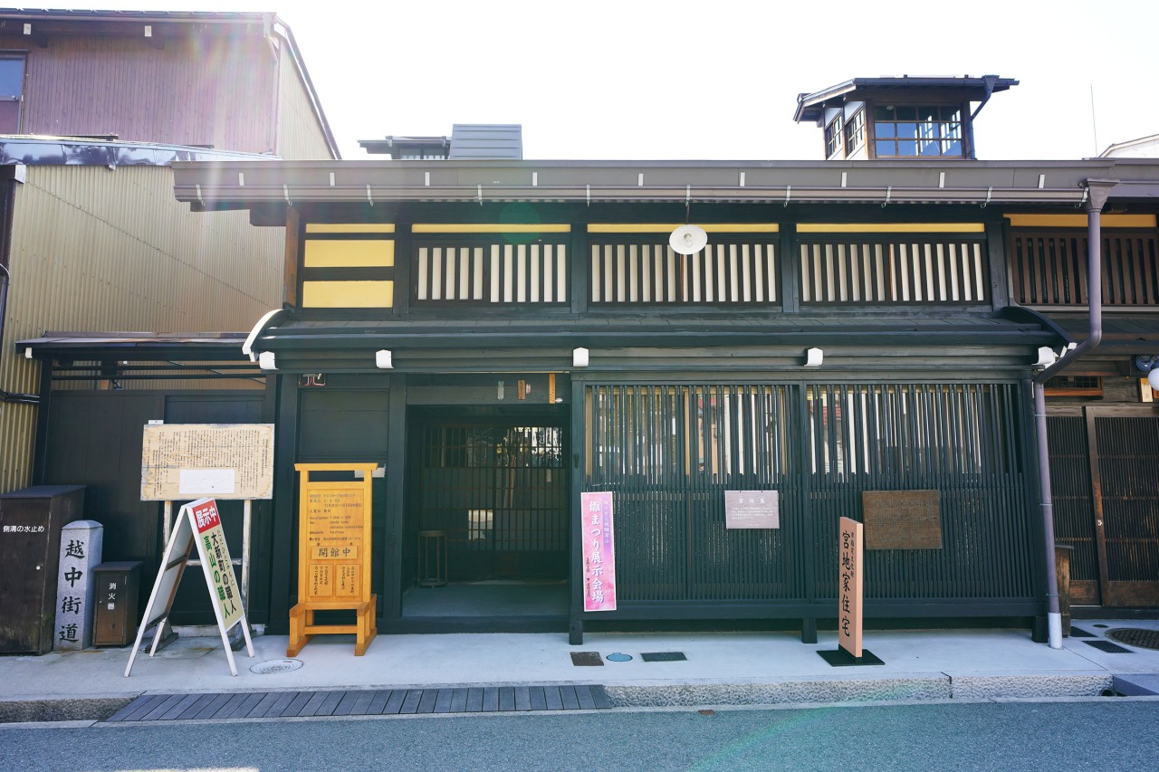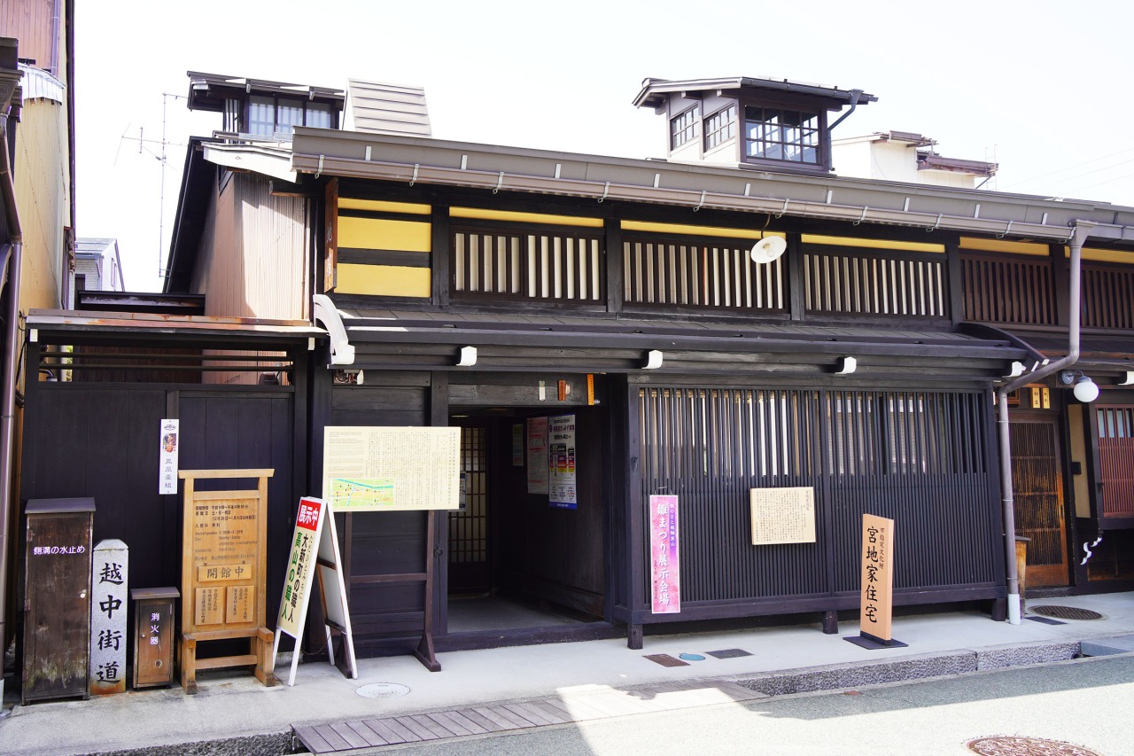 市文化財に指定されている宮地家。越中街道沿いにある、標準的な商家です。屋号を宮地屋といい、かつては酒屋や米屋を営み、養蚕もしていました。主屋は明治8年の大火後に建てられたもので、旧丹生川村三之瀬吉本家の山より材を調達したと伝わります。敷地は間口3間半のごく標準的な商家で奥行は12間程度あり、主屋、中庭、土蔵と並んでいます。土蔵より裏は空き地になっており、土蔵裏の車庫のあたりから河川敷部分となり、一段低くなっていたようです。明治9年の字絵図によると畑地が川端にあり、宮川の河川敷が今よりも広かったことが見てとれます。残存する建物の中でも改造を加えていない貴重な町家と言えるでしょう。