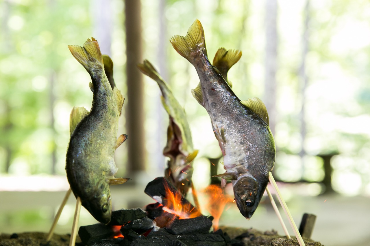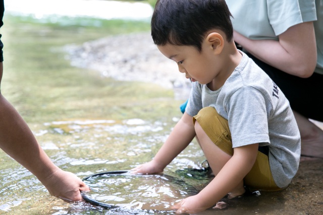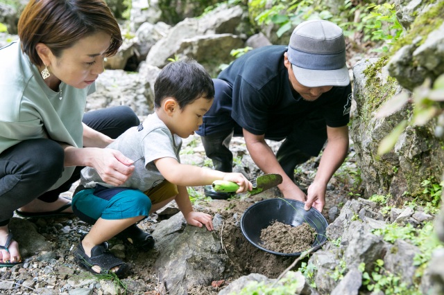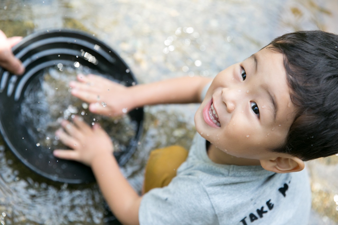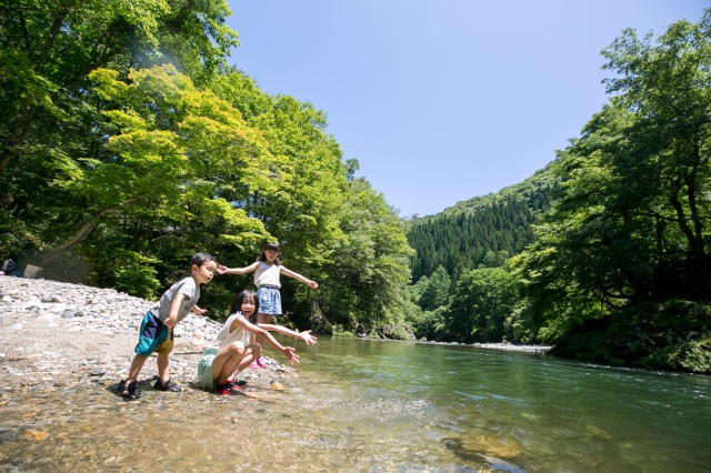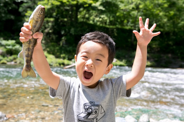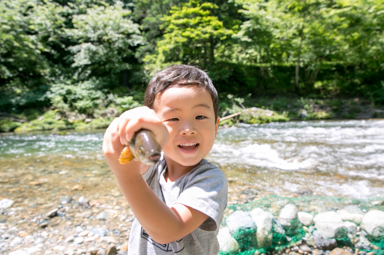 キャンプ場のそばを流れる馬瀬川は、イワナやアマゴが生息するとてもきれいな川で川遊びには最適。事前予約が必要となりますが、魚つかみ取り体験や砂金採り体験などのプログラムも実施しています。