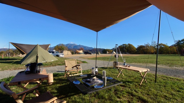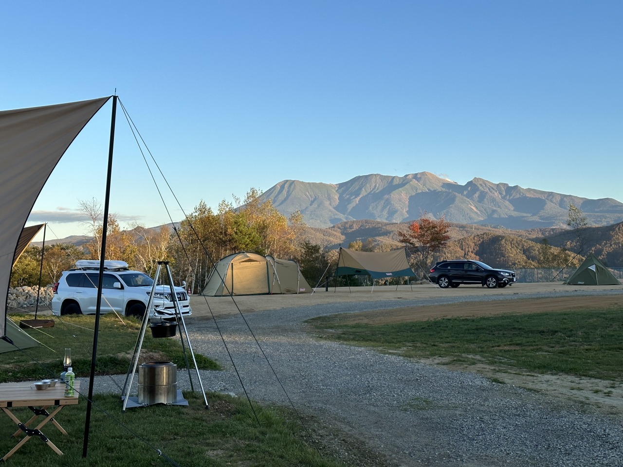 御嶽・乗鞍岳に望む、標高1400mのオートキャンプ場