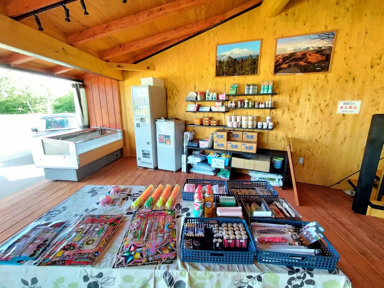 ・炭、薪、着火剤、ガス、グリル、ランタンなどのキャンプ用品から、お米、インスタント食品などの食料品、調味料飲料、紙皿、洗剤なども販売