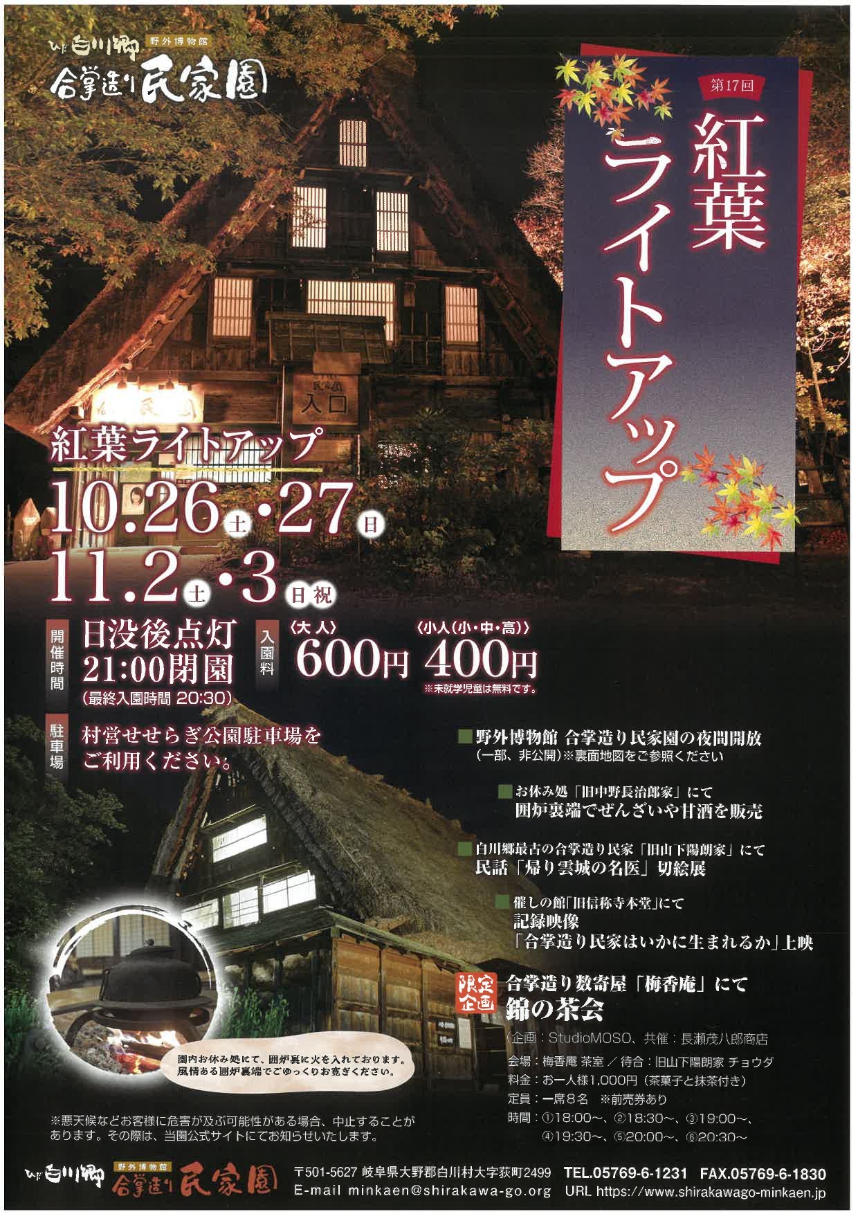 合掌造り民家園では、下記の日程にて、第17回となる紅葉ライトアップ(夜間営業)を行います。