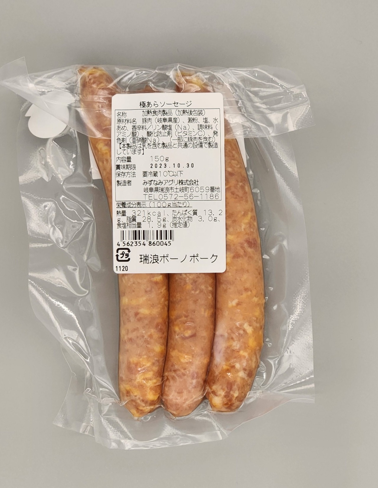 極あらソーセージは、原料の豚肉で瑞浪ボーノポークを100%使用しています。