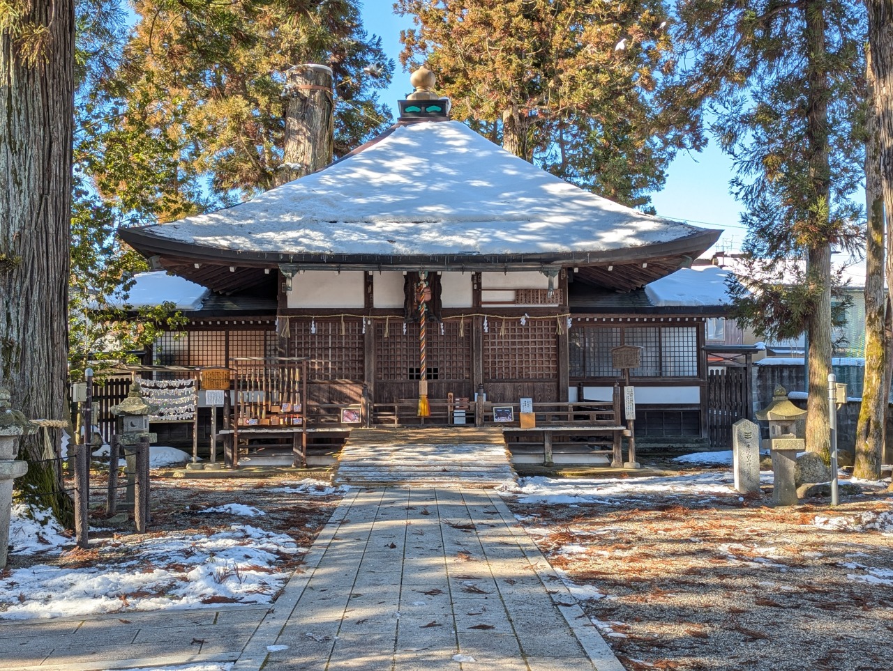 拝殿が市指定文化財となっている。神社建築には珍しい方形造の建物で、別名大成院といった。神仏混交時代の建造物であることがわかる。拝殿は慶長年間(1596~1615年)に創建され、天保10年(1839)に再建され、その時の大工棟梁は小笠原喜四郎であったことが棟札に記されている。昭和52年には、拝殿の床板、縁側などの小修理と、接続する両脇殿、渡殿の解体修理を行なった。また、渡殿に接続する指定外の建物・本社覆殿の改築も行なっている。