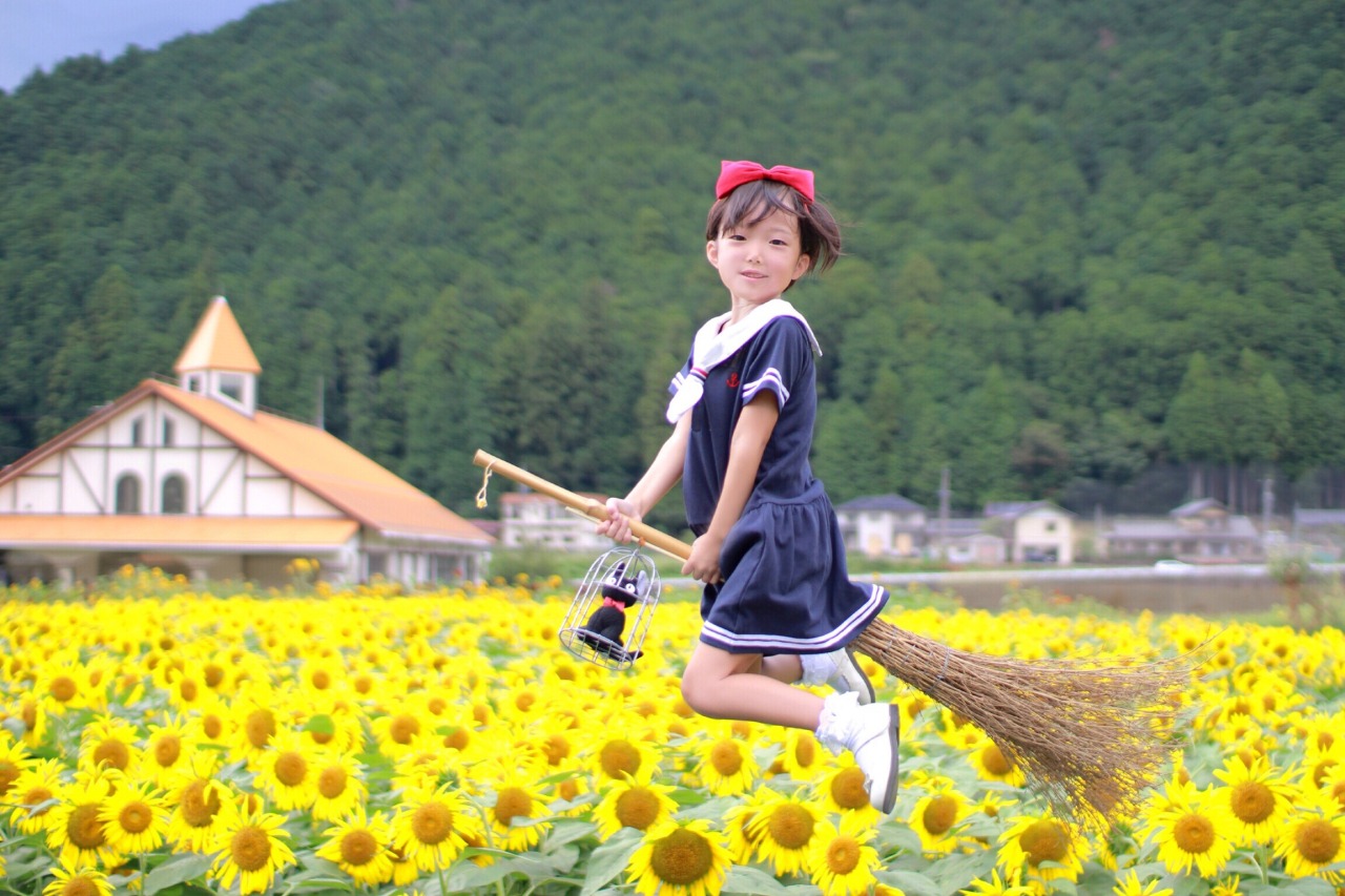 ひまわりの季節には花畑に設置された撮影台で空飛ぶ魔女の写真撮影をして「魔女コンテスト」に応募することができます。