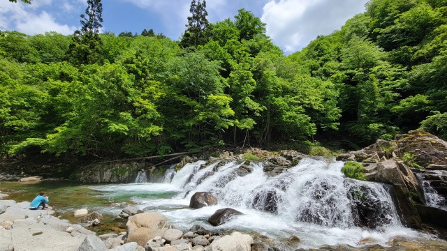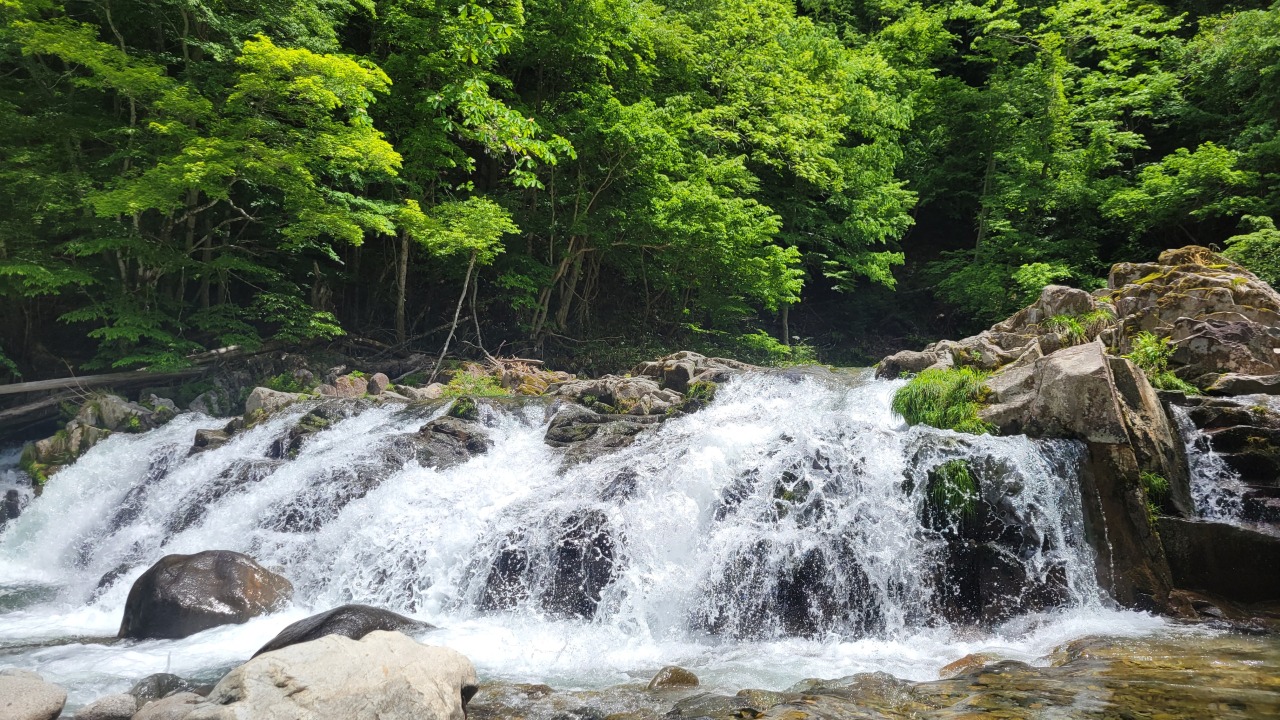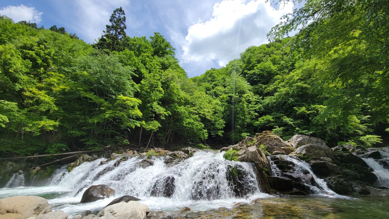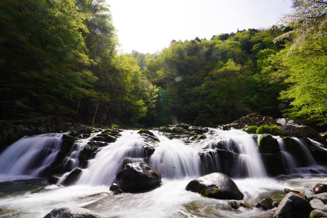 せせらぎ街道沿い、川上川の川幅いっぱいに広がり、清流が岩肌を滑る姿が美しい滝。車を停めてドライブ中の散策にぴったり。四季を通じて人気の写真スポットとなっています。