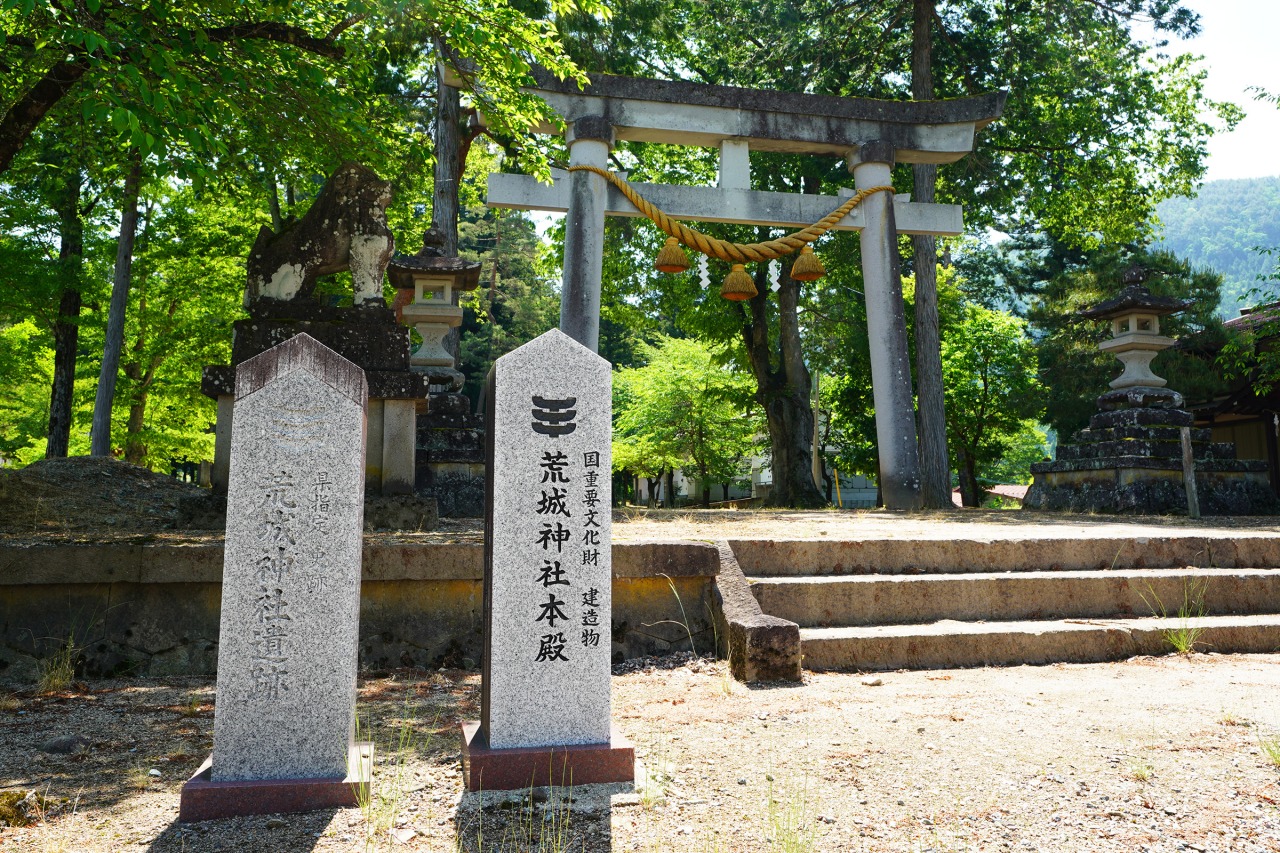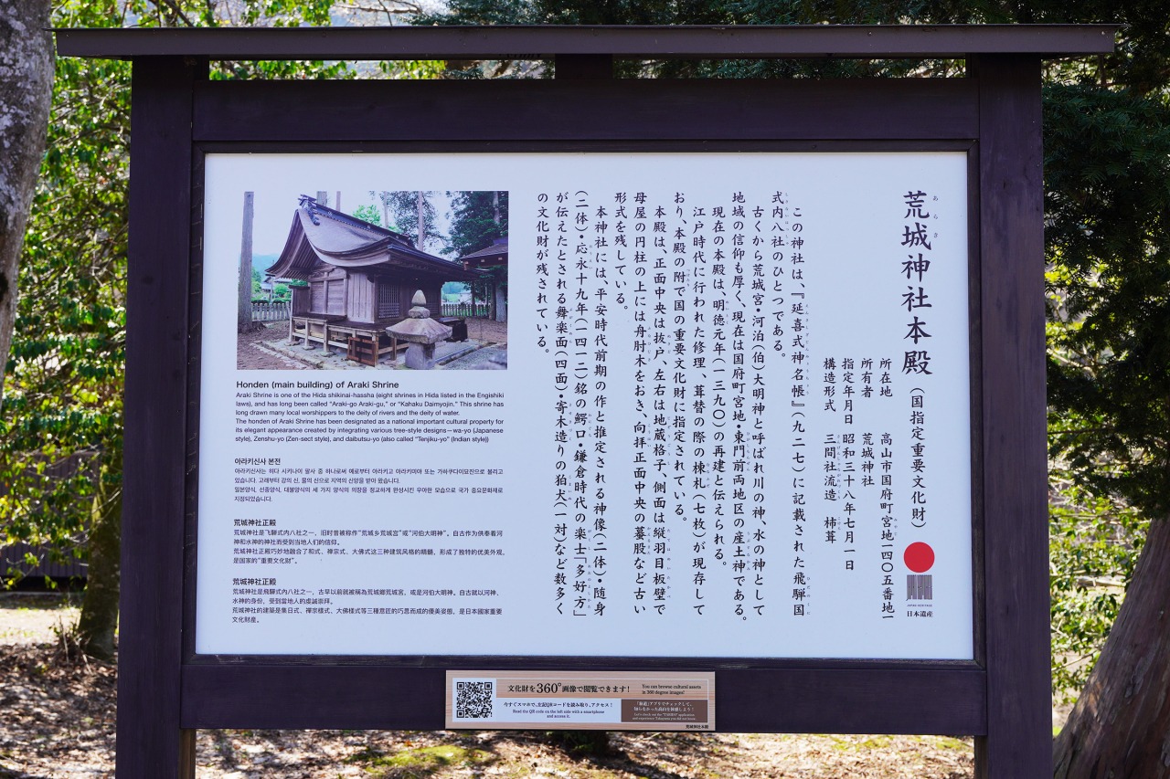 荒城神社は延喜式神名帳(927年)に飛騨式内八社の一つと記され、古来より川の神、水の神(河泊大明神)として地域の信仰を集めてきました。本殿は室町初期の三間社流造り、杮板葺きの建物全体が優美な姿です。国により重要文化財に指定されています。