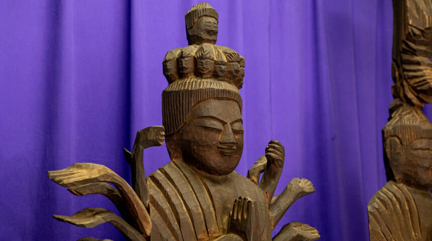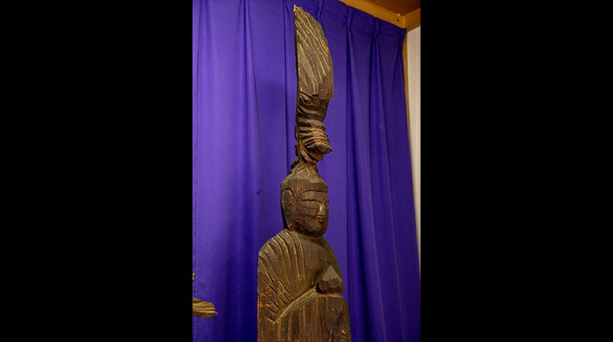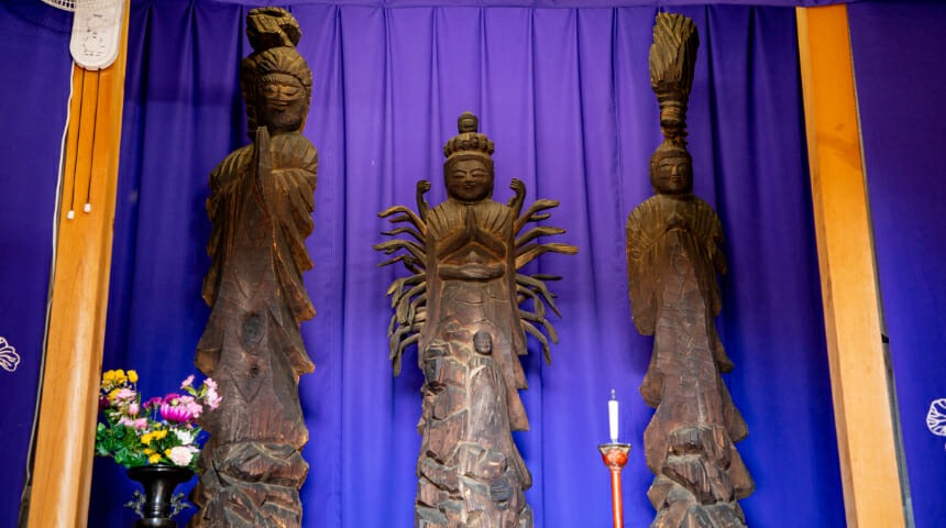 清峯寺にある円空仏三体は、円空の代表的な名作といわれています。円空が、1690年頃この地に滞在し桧材に一刀彫りしたものと伝えらえています。中でも特に、最高傑作といわれる千手観音は、円空が残した全作品の中で数体しかない大変貴重なものです。さらには、等身大の大きさに驚くことでしょう。