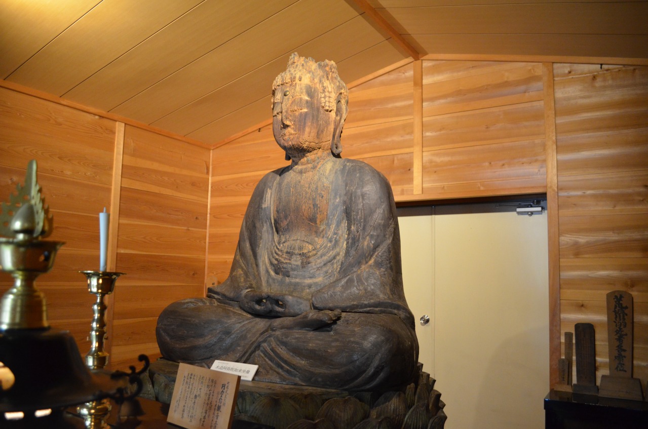 この大仏は、地元では「木曽垣内のおおぼとけ」といわれています。仏身の丈は2m、仏の顔の長さは0.6m、肩幅は1m余りです。蓮華座に座した阿弥陀如来像は、いわゆる丈六像といわれるもので、飛騨地方では例のない木造如来像です。親指と人差し指で輪をつくり、ひざの上で手を組み、大きい耳たぶが際立っています。