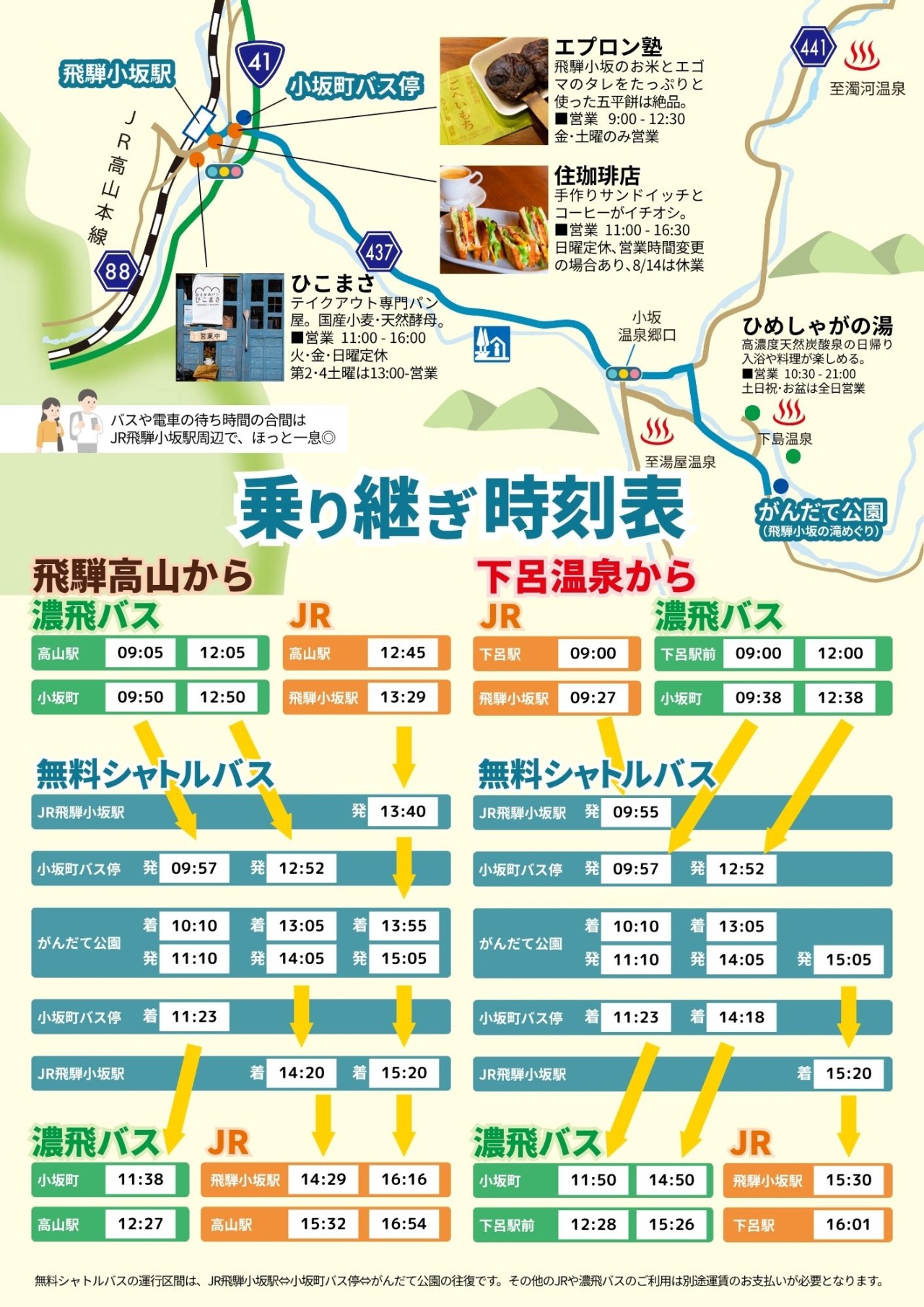 上記の乗り継ぎ時刻表は、JR飛騨小坂駅⇔小坂町バス停⇔がんだて公園間の無料シャトルバス運行に合わせたおすすめの行程です。