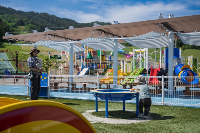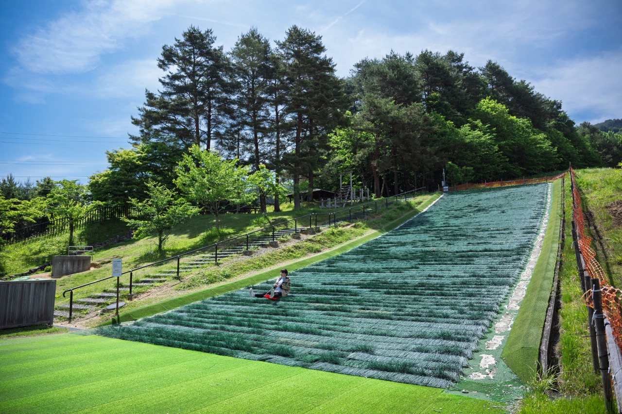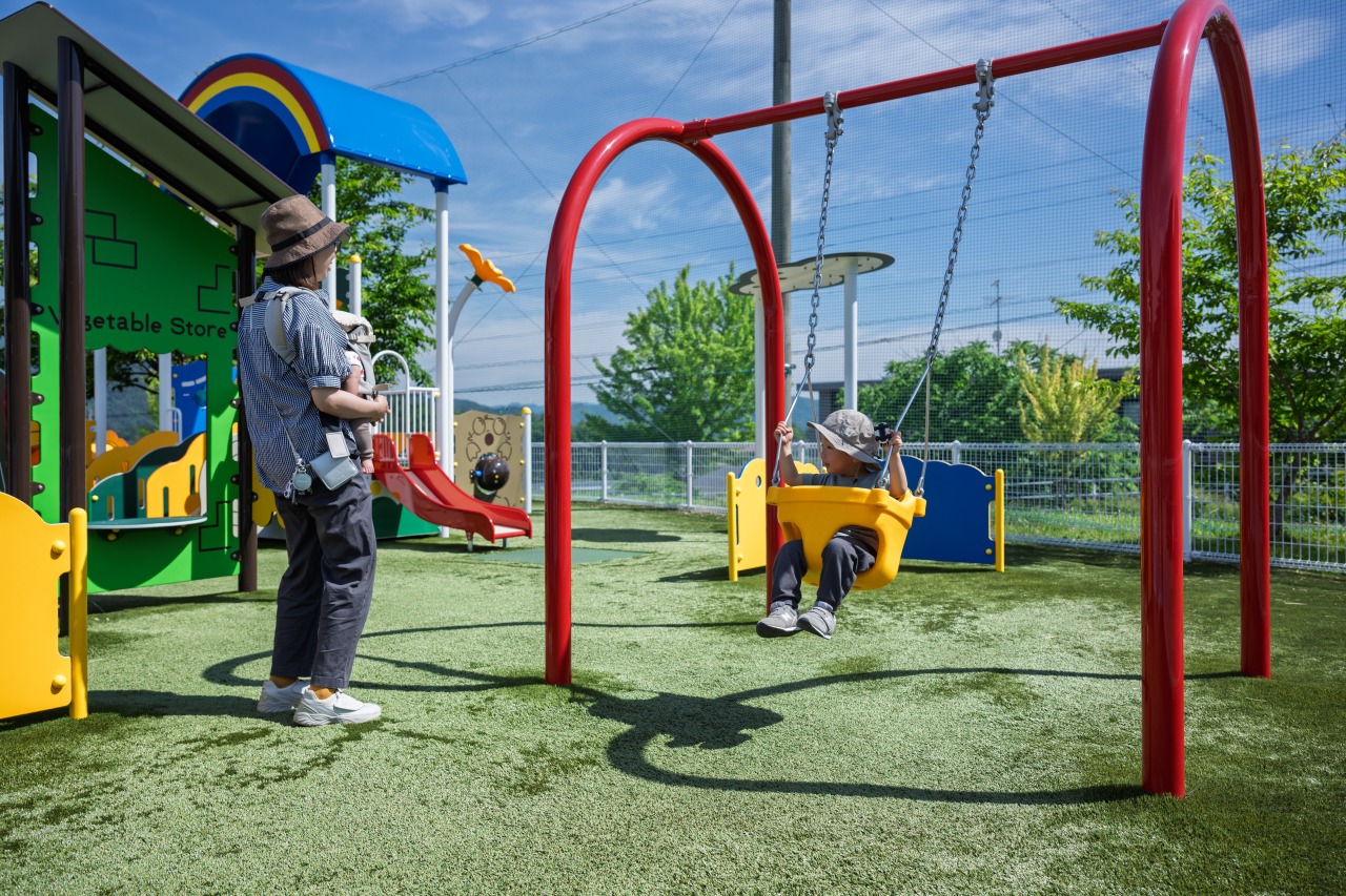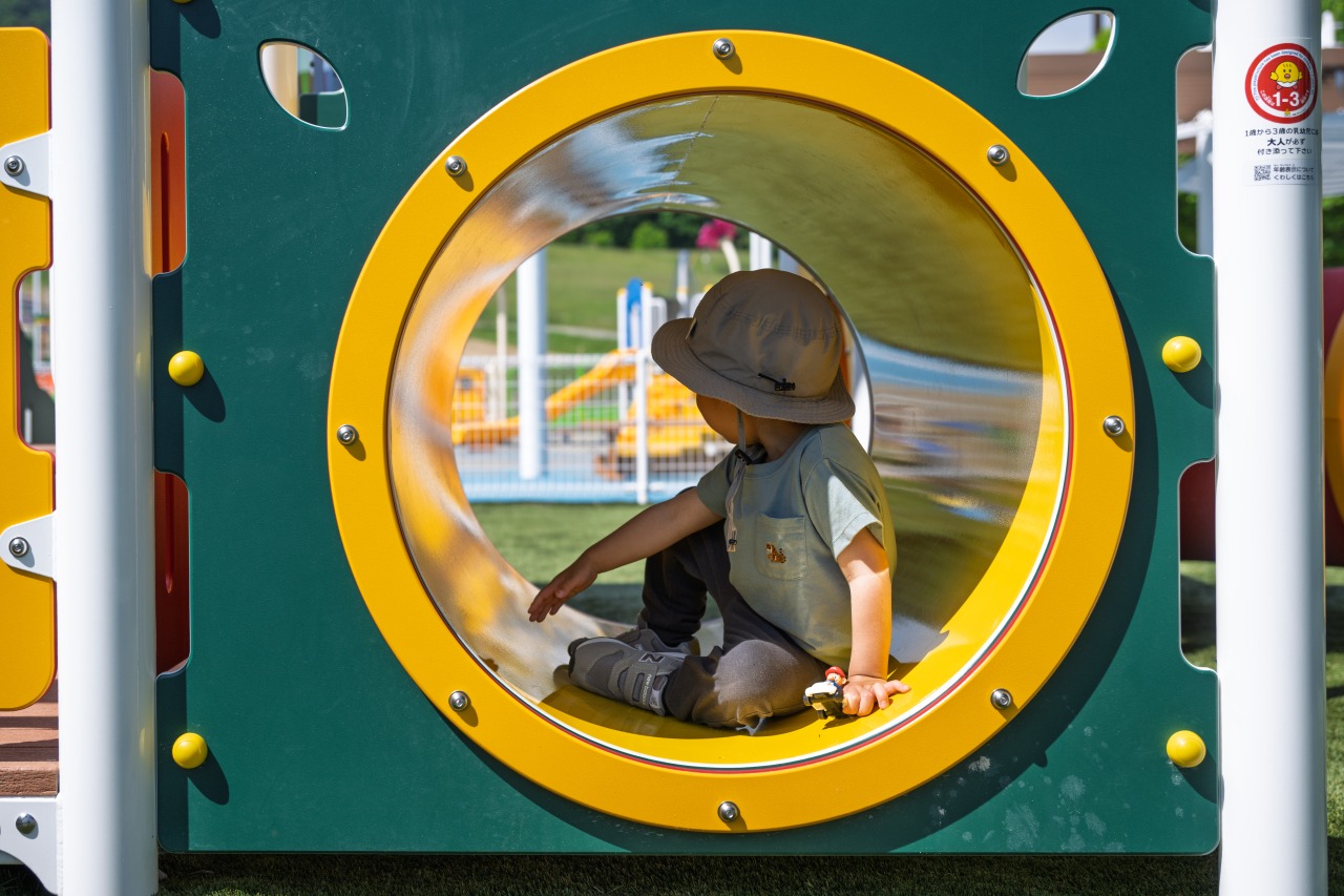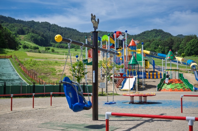 高山市新宮町の「原山市民公園」は、かつての原山市民スキー場跡地を整備した公園です。2025年5月にリニューアルされ、長い滑り台や高低差のある複合遊具など、小学生まで楽しめる大型遊具が新設されました。以前からある人工芝のソリ滑りも人気で、休日には多くの子どもたちで賑わいます。