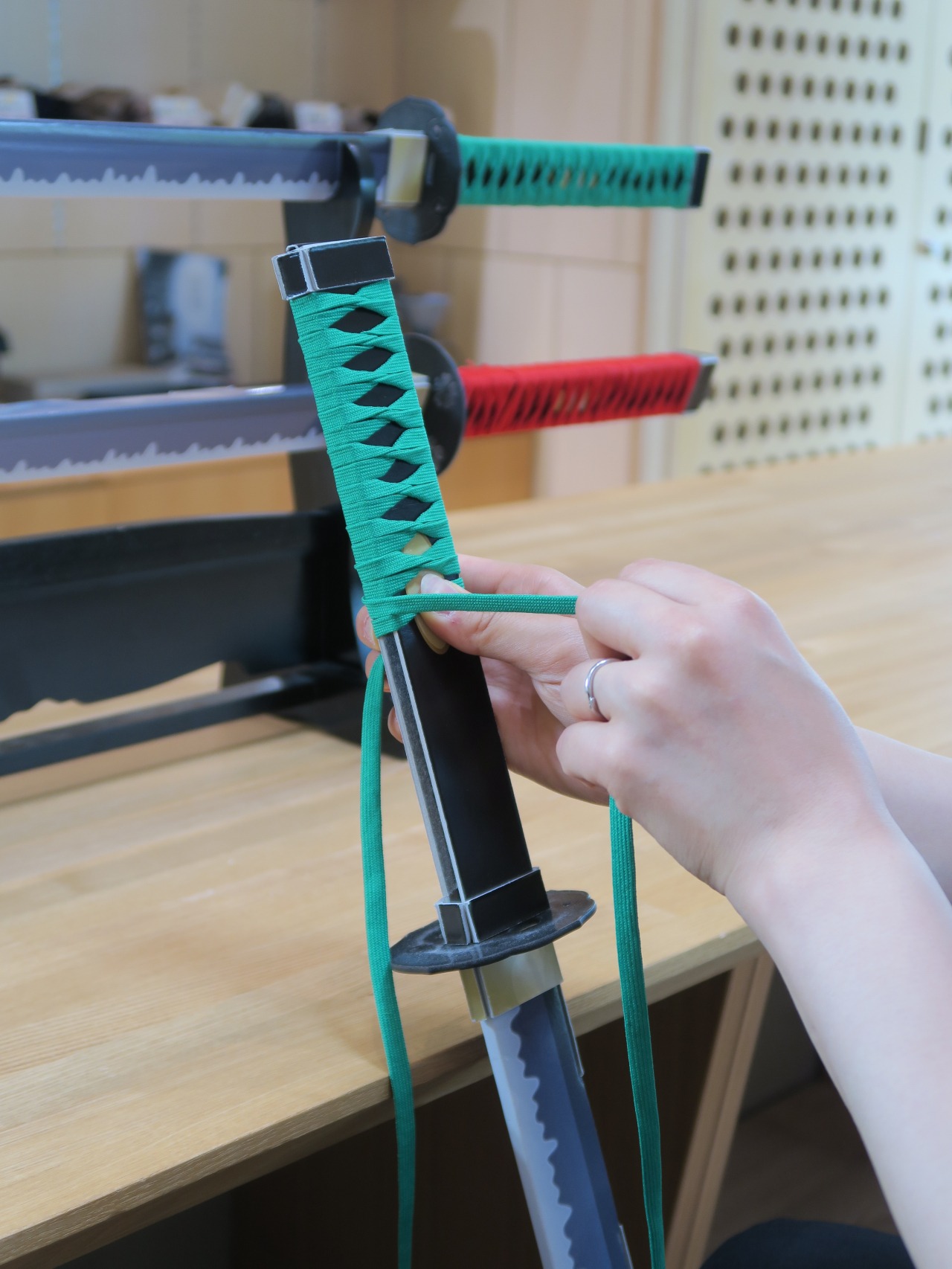 持ち手部分「柄」は、実際に糸を巻きつけ「柄巻」を体験!