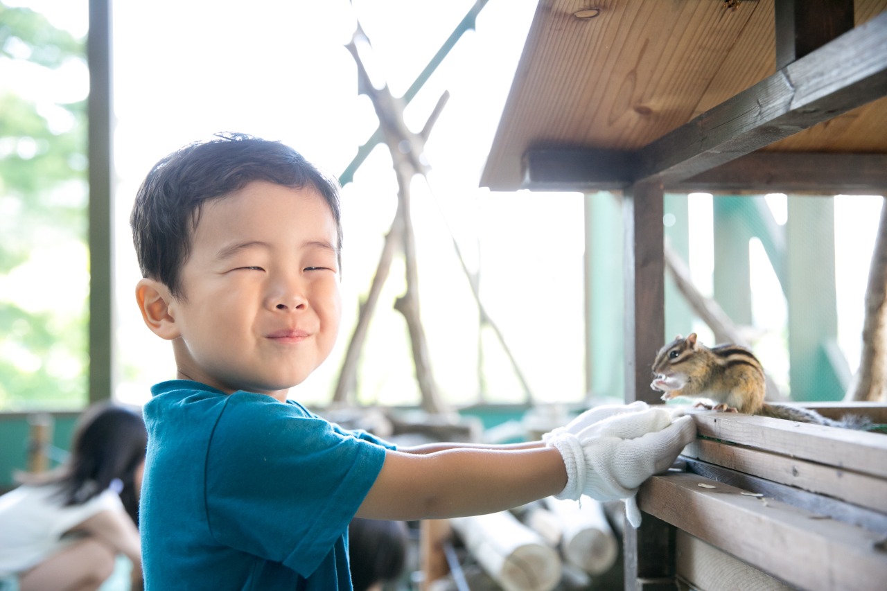 併設の「りす・うさぎと遊べる森」では、人懐っこいシマリスたちが服を登ってくるほど積極的に寄ってきて、手乗りでの餌付けも可能です。雨の日でも安心な屋根付きの施設で、大人も子供も心ゆくまで癒やされます。スカートや肌が出ている服装の場合、リスが上ってくることがあるのでご注意ください。