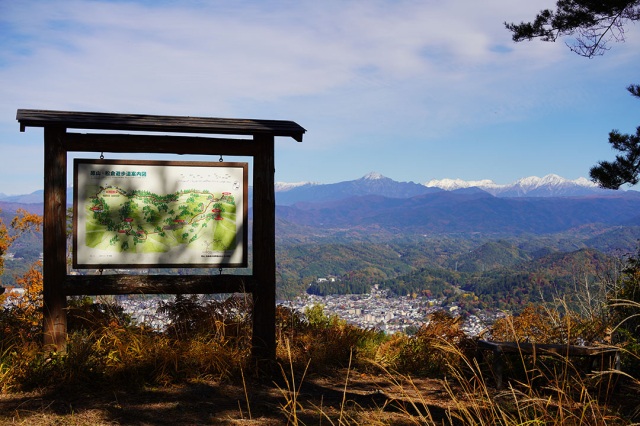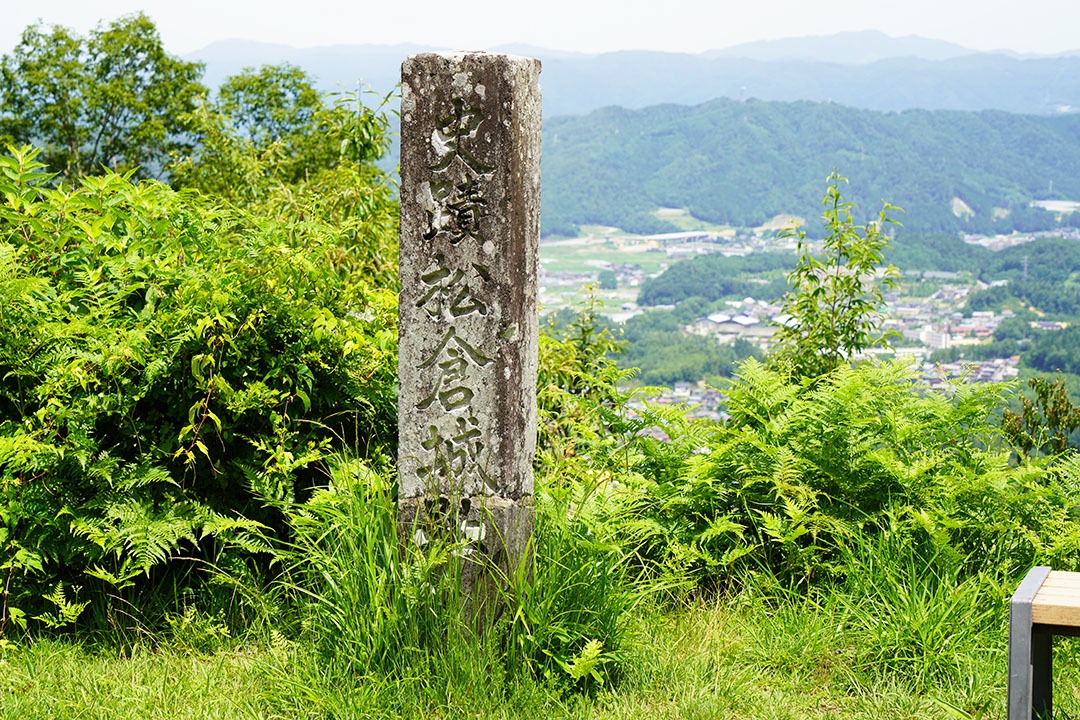 室町時代に築かれた山城跡、堀切や曲輪、石垣で囲まれた本丸、二ノ丸、三ノ丸跡が残る